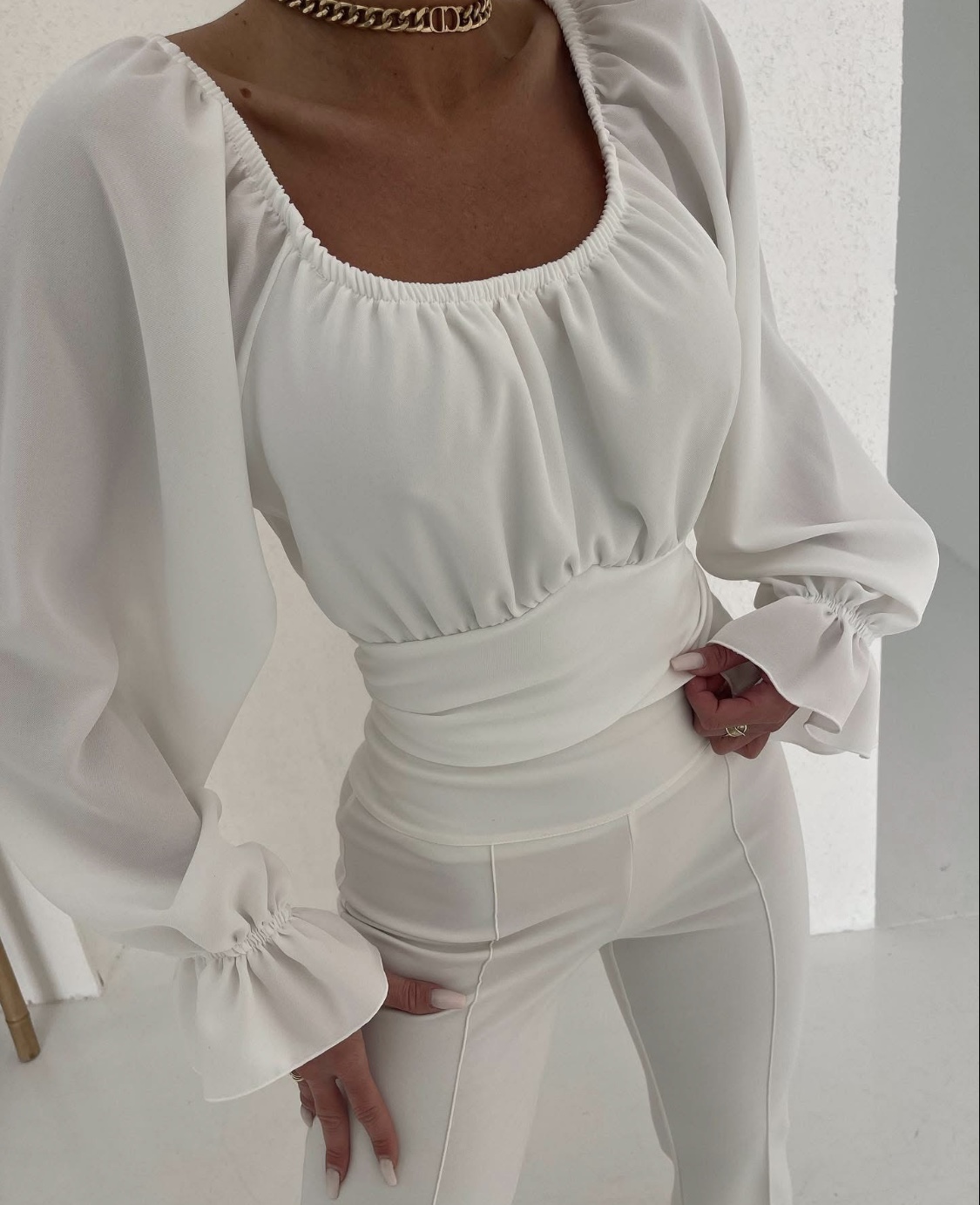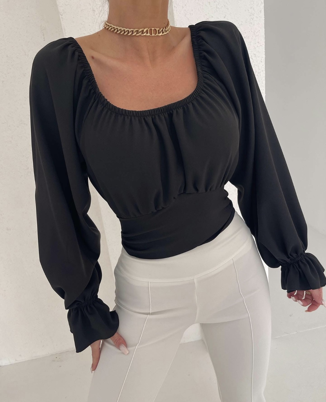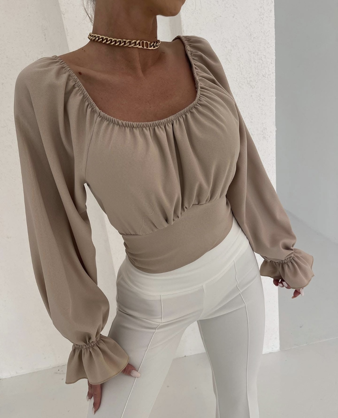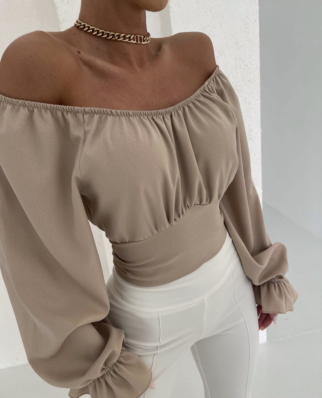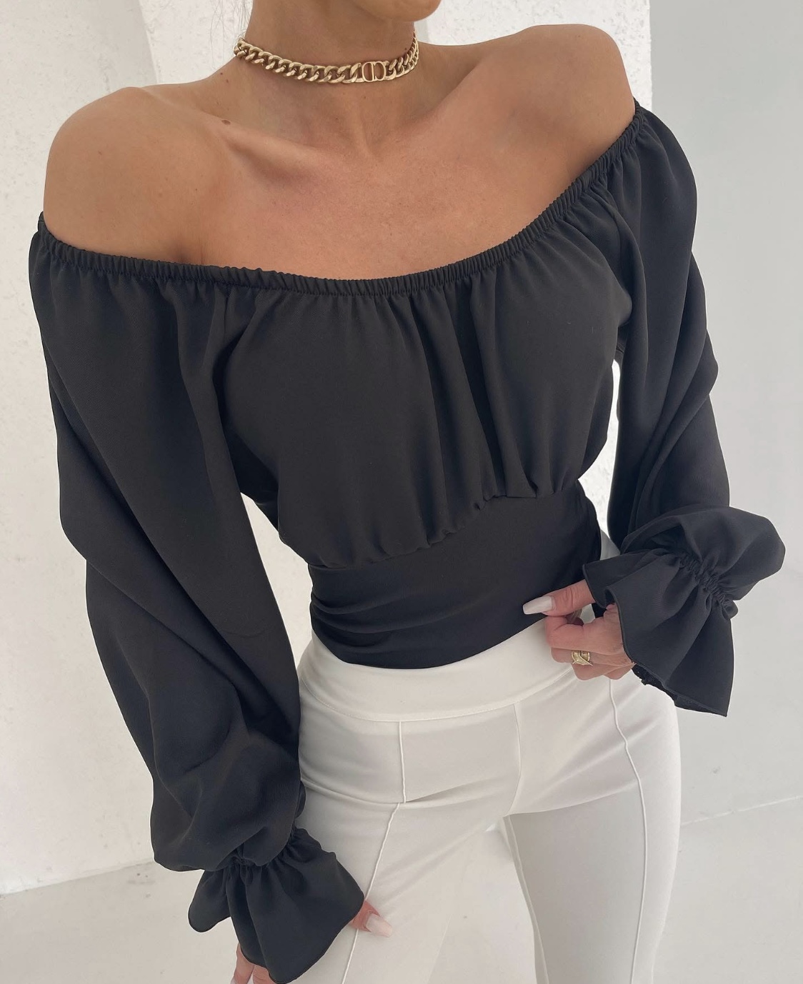 Delikatnie odsłonięte ramiona, romantyczne falbany i lekko rozkloszowane rękawy tworzą efekt WOW w każdej stylizacji – od casualu po wieczorne wyjścia.